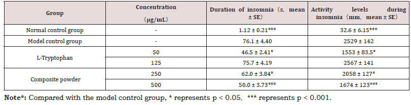 The efficacy of the composite powder in improving sleep quality was assessed in a zebrafish insomnia model induced by PTZ. The model control group exhibited a pronounced increase in both the duration of insomnia and locomotor activity during the sleep period. As detailed in Table 5, treatment with the composite powder at 250μg/mL and 500 μg/mL significantly reduced these parameters in a dose-dependent manner. The high concentration (500 μg/mL) produced effects comparable to the positive control, L-Tryptophan, confirming the formulation’s potent sleep-aid properties. A representative behavioral trajectory (Figure 1) visually corroborates the reduction in hyperactive, insomnia-like movement following treatment (Table 5) (Figure 1).