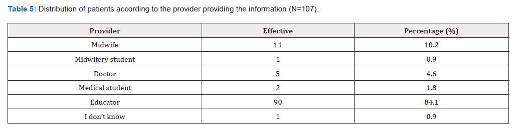 In our family planning center, the provider who provided information about postpartum contraception was mainly the educator (84.1%) and the midwife for 10.2% of the parturients. It is essential that professionals intervene in women’s choice of contraception. Their role of information is crucial and allows them to guide women in their contraceptive choices. Contraceptive education is generally considered a standard component of postpartum care. According to Lopez et al, educational interventions delivered to individuals or groups can increase contraceptive uptake as well as method use and continuation [28].