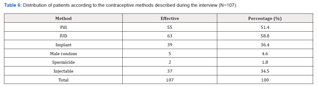 Table 6: Distribution of patients according to the contraceptive methods described during the interview (N=107).