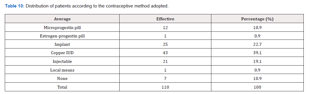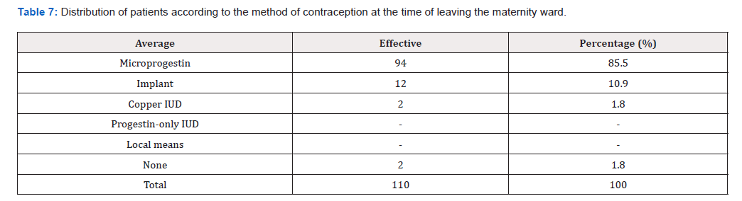 Table 7: Distribution of patients according to the method of contraception at the time of leaving the maternity ward.