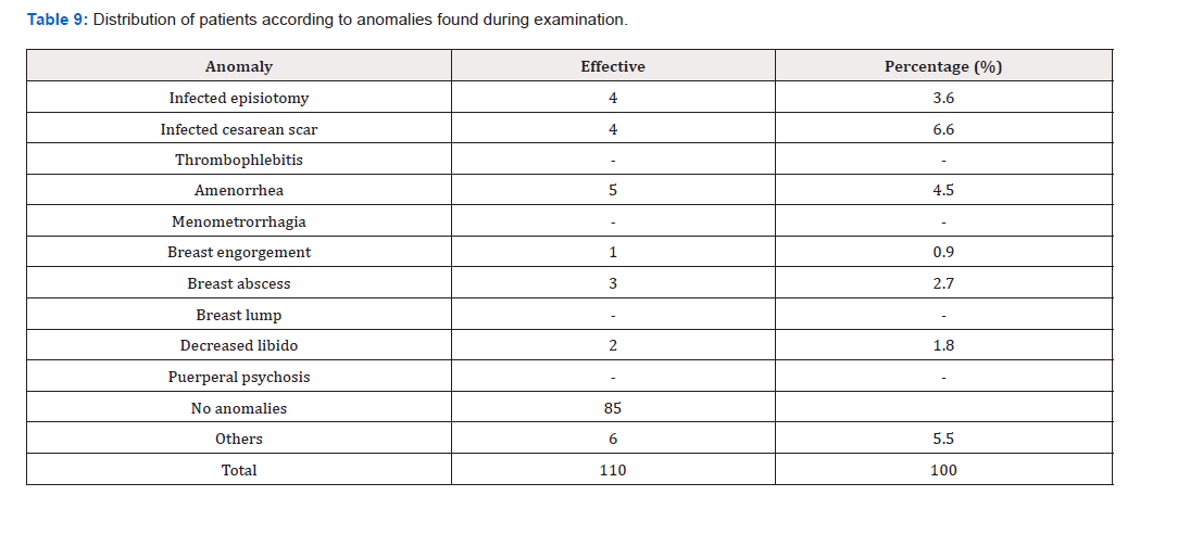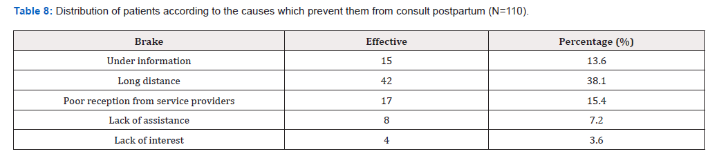 For the interest of postpartum consultation, we stated that in 87.3% of the cases, the interest of the postpartum consultation was to offer effective contraception. While 44.5% cited the interest of encouraging breastfeeding. This consultation is of capital importance, both from a purely clinical aspect, which aims to assess the physical and psychological consequences of childbirth and any after-effects that could be treated, and from a more social aspect, which aims to help the patient adapt to her new role as mother and the difficulties that this may entail [21-23].