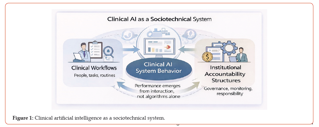 Evidence from biomedical informatics and health services research suggests that these failures rarely arise from algorithmic deficiencies alone. Rather, they emerge from interactions between AI systems and the socio technical environments in which care is delivered, including clinical workflows, documentation practices, reimbursement incentives, and institutional accountability structures [1-3]. Healthcare delivery operates as a distributed work system in which decision making is jointly produced by clinicians, information technologies, and organizational processes rather than isolated agents or tools.