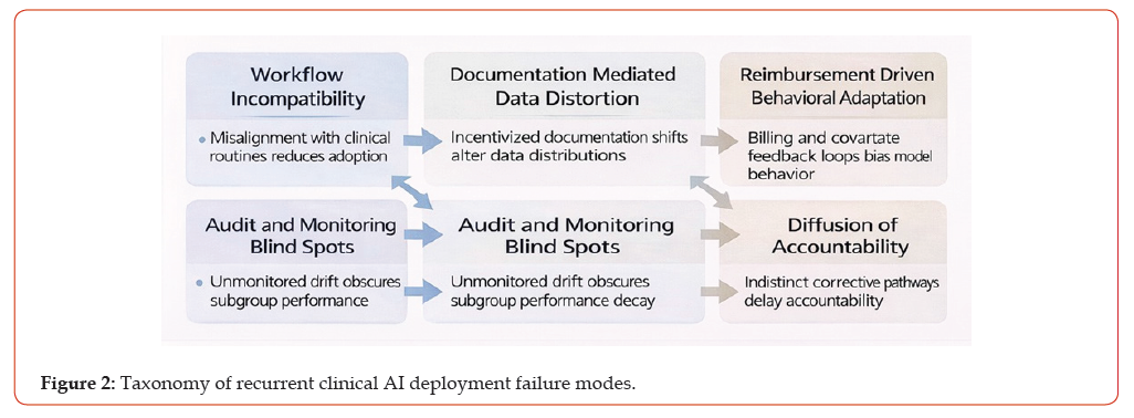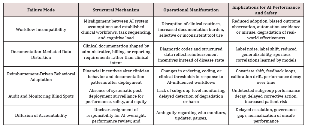Five higher-order failure modes recur across clinical AI systems and institutional contexts: workflow incompatibility, documentation-mediated data distortion, reimbursement-driven behavioural adaptation, audit and monitoring blind spots, and diffusion of accountability. Although these failure modes manifest differently across applications, they reflect shared structural mechanisms that undermine sustained effectiveness after deployment (Figure 2).