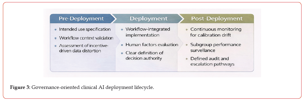 A lifecycle framework mapping recurrent sociotechnical failure mode to actionable governance checkpoints across predeployment, deployment, and post-deployment phases. The framework emphasizes intended use specification, workflowintegrated implementation, and continuous monitoring with defined accountability and escalation pathways to support sustained safety and effectiveness of clinical AI systems (Figure 3).