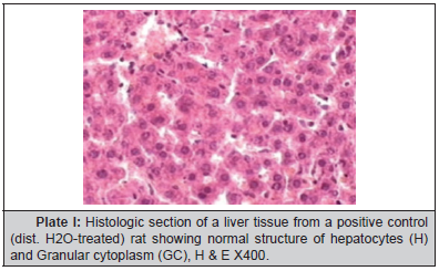 Plate I:Histologic section of a liver tissue from a positive control (dist. H4O-treated) rat showing normal structure of hepatocytes (H) and Granular cytoplasm (GC), H & E X400.