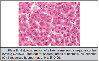 Plate II: Histologic section of a liver tissue from a negative control (5ml/kg C2H5OH- treated) rat showing areas of necrosis (N), oedema (O) & moderate haemorrhage, H & E X400.