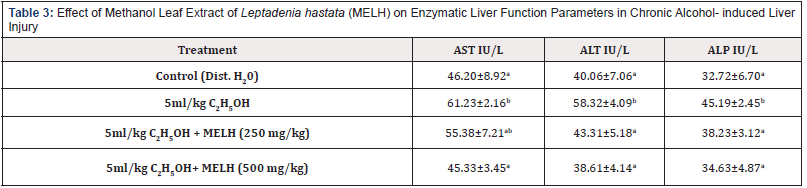 Table 3: Effect of Methanol Leaf Extract of Leptadenia hastata (MELH) on Enzymatic Liver Function Parameters in Chronic Alcohol- induced Liver Injury
