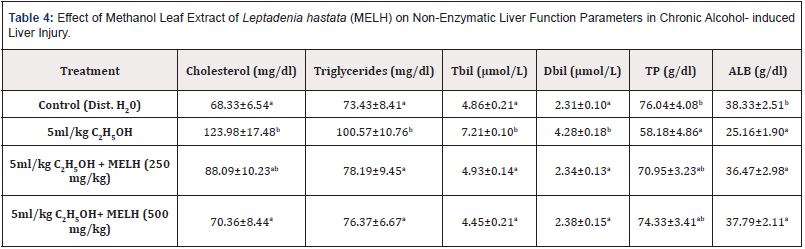Table 4: Effect of Methanol Leaf Extract of Leptadenia hastata (MELH) on Non-Enzymatic Liver Function Parameters in Chronic Alcohol- induced Liver Injury.