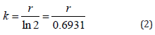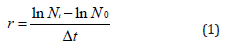 The specific growth rate (r) is used to estimate the number of cell divisions per day known as doubling per day (k), by equation (2) [25].