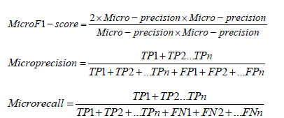 We used micro F1, micro precision, and micro recall metrics to assess the performance of the proposed random forest classifiers. The micro F1, micro recall, and micro precision scores are defined using the following equations.