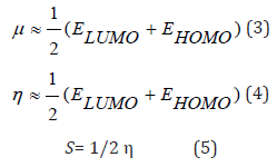 The equations 1 and 2, for μ and η respectively, are numerically determined by approximations based on finite differences of three points, as shown in the following expressions 3 and 4 [30], using the energies E_LUMO and E_HOMO for GAP (ELUMO - EHOMO) calculation [31]. The softness S is the inverse of η chemical hardness, and constitutes a useful concept on the prediction of chemical reactivity [32], as shown in the following expressions: