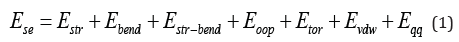 The steric energy, bond stretching, bending, stretch-bend, out of plane, and torsion interactions are called bonded interactions because the atoms involved must be directly bonded or bonded to a common atom. The van der Waals and electrostatic (qq) interactions are between non-bonded atoms.